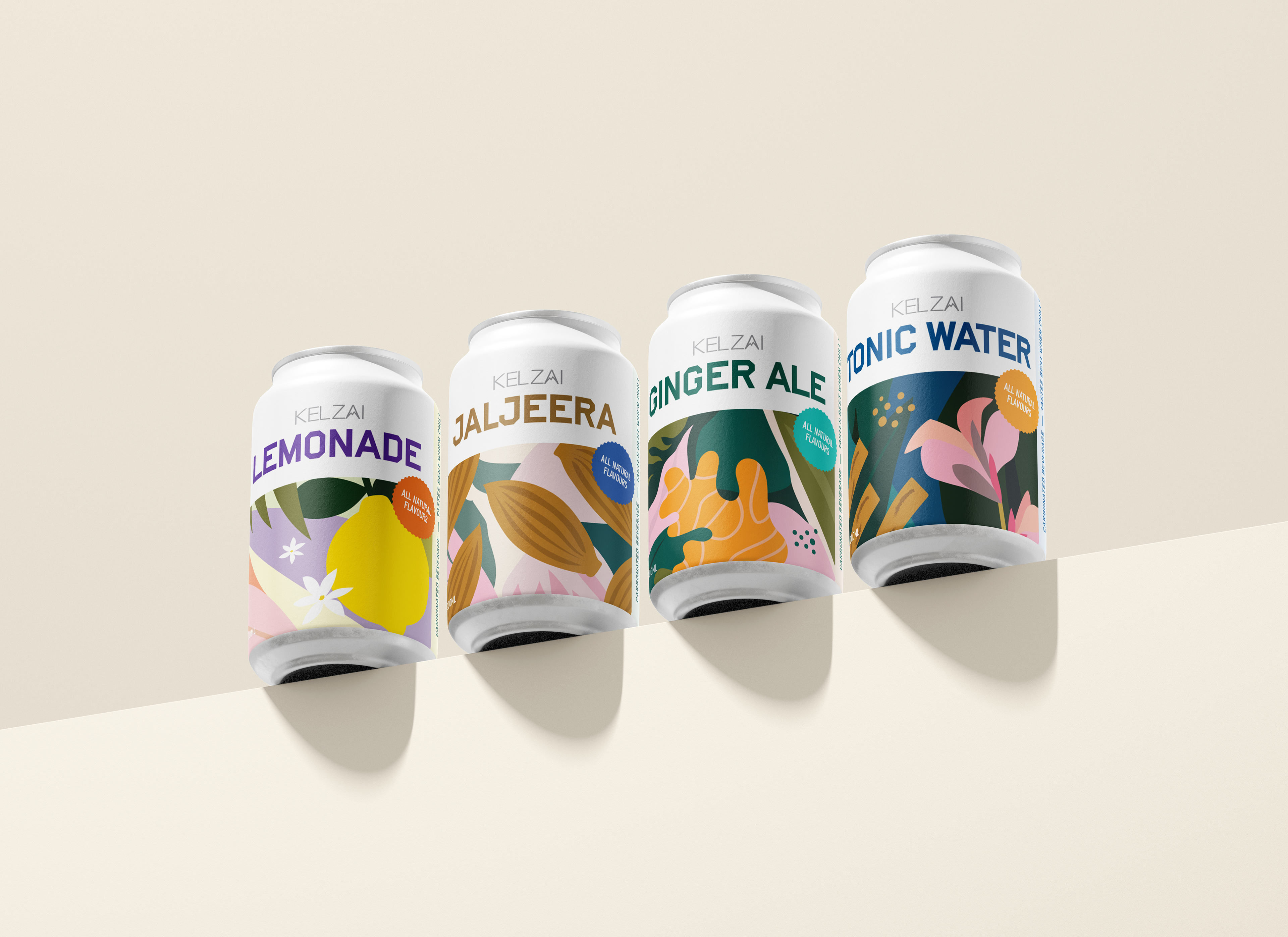 The label design reflects this carefree, vibrant spirit through custom illustrations that celebrate the hero ingredient of each flavour. With organic, hand-drawn shapes and a palette of bold, lively colours, the packaging brings forward the playful energy that defines the Kelzai brand.
